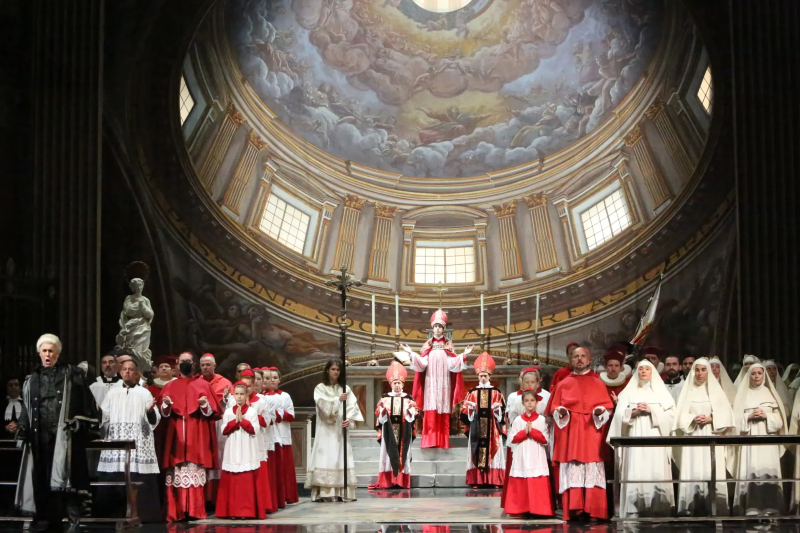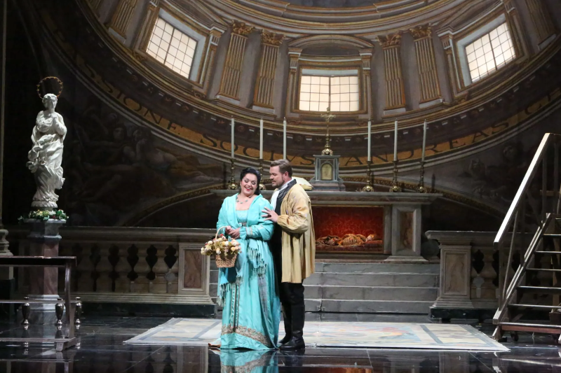 Prvi se čin zaista odvija u crkvi Sant’Andrea della Valle a ne bilo kojoj, što znamo po reprodukciji detalja kupole, drugi čin prikazuje luksuznu Scarpijinu kancelariju kakvu bismo mogli očekivati u palači Farnese, a u trećem činu riječ je stvarno o Anđeoskoj tvrđavi (Castel Sant’Angelo) – u daljini se lijepo nazire i Vatikan. Ukratko, za današnje prilike u HNK-u nevjerojatno raskošna inscenacija u kojoj je sve na svojem mjestu, u kojoj gotovo da nema suvišnih detalja i u kojoj se redatelj nije trsio pokazati koliko je originalan nego je, znajući da je Tosca previše prostorno i vremenski zadana da bi trpjela kojekakve nadgradnje, omogućio publici vizualan užitak i mogućnost potpune usredotočenosti na Puccinijevu partituru. Barem onom dijelu publike koji ne misli da su dijelovi povjereni isključivo orkestru namijenjeni žamoru u gledalištu.