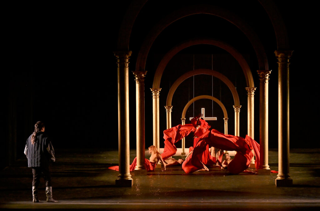 Redateljica se obilno poslužila plesnom umjetnošću. Scenom su u nekoliko navrata prodefilirali plesači, također cvijećem nakićeni, a u pojedinim prizorima oko naslovne junakinje bile su plesačice koje su horor-plesom kontekstualizirale demonsku prijetnju oko koje se sve vrti. Opisana intervencija (koreografkinja: Manuela Lo Sicco), izuzev jednog prizora, doista je dobro funkcionirala. Plesači su bili odlični, pa ćemo ih i nabrojati: Davide Riboldi, Daniele Savarino, Angelica Dipace, Francesca Laviosa, Marta Franceschelli, Rita Russo, Simona Sciarabba i Benjamin Cockwell. Kostimografija Vanesse Sannino djelomično je pogođena, međutim problem je što nije do kraja pratila inicijalno klasično zamišljenu predstavu. Poradi toga, kostimi zbora u posljednjem dijelu izgledali su kao rashodovani popluni za krevet, dok je s opravama solista sve u svemu bilo više sreće. Luigi Biondi oblikovao je svjetlo koje je naglašavalo sve elemente oko kojih je redateljica isplela priču. Svjetlo je dalo poseban čar posljednjoj slici predstave, u kojoj legendarna heroina leži na križu prekrivenom cvijećem.